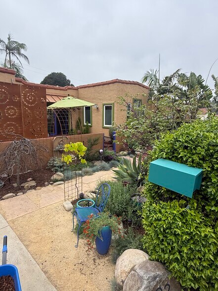 Beautiful, private front yard and fenced backyard yard oasis with mature fruit trees.