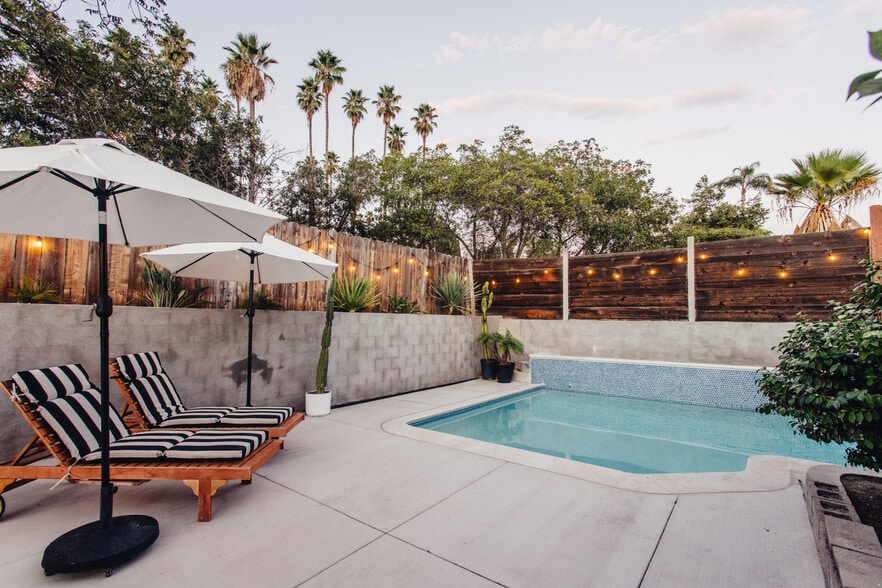 The property has a pool and hot tub. The back patio with pergola is fantastic for socializing and having family time. House sits back from the street and has fruit trees, palms, and giant birds that provide privacy and a sense of peace. House is just off the Mar Vista exit of the 78, so accessing the freeway is easy, while being set back far enough to avoid highway noise.