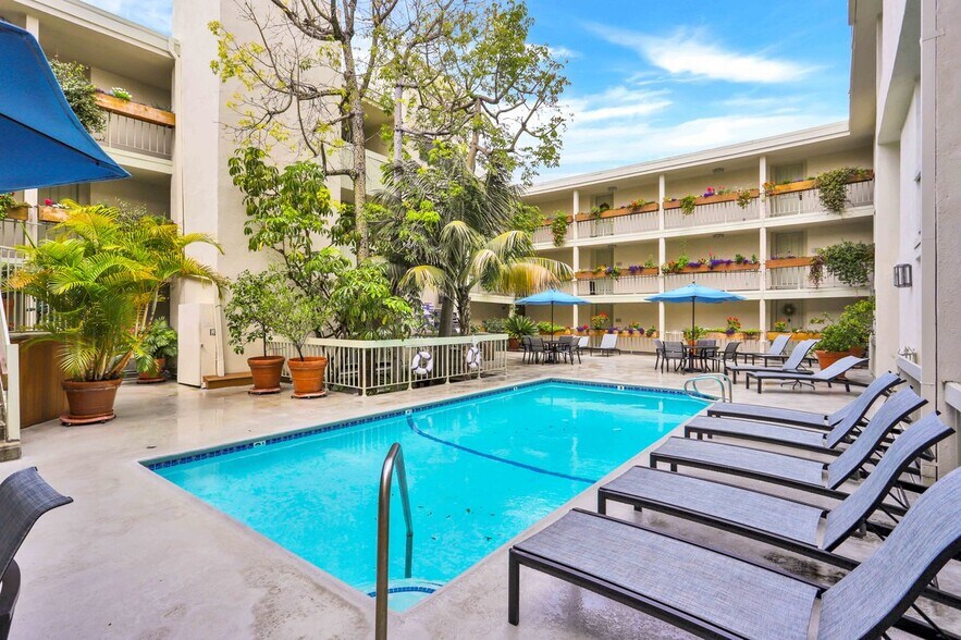 Location, location, location is what this furnished 1 bedroom / 1 bathroom with easy access to the pool has to offer. This unit provides a newly renovated kitchen with marble countertops and stainless steel appliances, gas fireplace, AC, refrigerator, TV and one indoor parking spot. Amenities include community pool, jacuzzi, BBQ and gym. Rent includes water, sewer, garbage and gas. Laundry on site in every floor. Won't last long. Minutes away from restaurants, shops and nightlife Santa Monica Blvd and Sunset Strip. PET FRIENDLY.