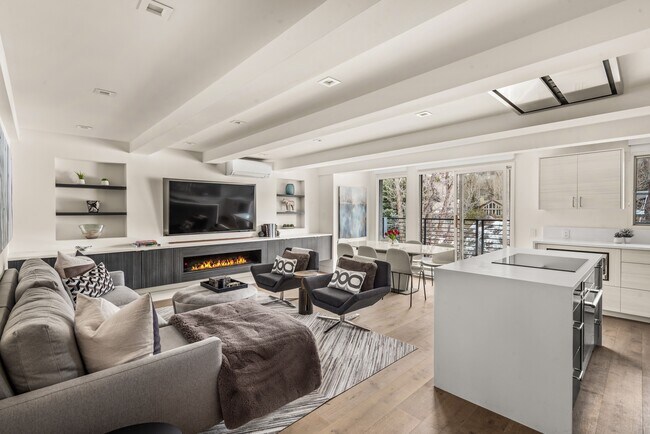 Welcome to the newest luxury rental property at Chateau Roaring Fork. This beautifully remodeled four-bedroom residence is one-of-its-kind with high-end finishes throughout, all new Restoration Hardware furnishings and beautiful unique art. The open concept living room, dining room and kitchen offers a great gathering place for family and friends. The dining room sliding doors open onto a balcony with views of the Roaring Fork River and Independence Pass. Listen to the sounds of the river from the primary suite. A/C on the upper and lower level, a large pool, hot-tub, sauna, ski locker and newly upgraded gym makes this a great location for your Aspen stay. Just three blocks to the Gondola Plaza, central Core shopping and dining. Make this your home away from home for the season or the year!