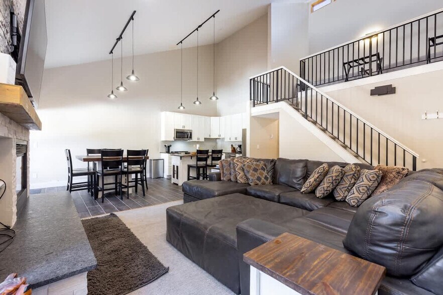This beautifully appointed condo features two primary bedrooms, both with an en-suite bathroom. The loft area, overlooking the living room, includes additional sleeping arrangements. Relax in the spacious living room, where a stone fireplace creates a cozy ambiance. The living area opens up to a dining space that comfortably seats eight, with additional bar seating available at the kitchen counter. The newly remodeled kitchen is ready for your culinary adventures, featuring modern appliances, solid-surface countertops, and all the necessary cookware and gadgets. Amenities include smart TVs in the living area and bedrooms and an in-unit washer and dryer.