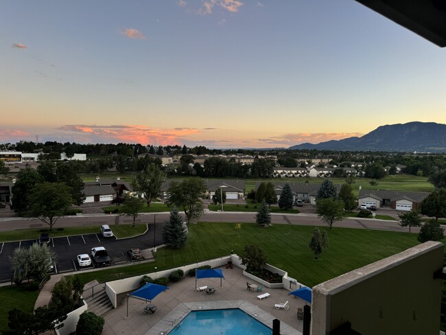 Large 1 bdrm 3rd floor condo at the Satellite Hotel. Great location close to Peterson AFB, Airport and downtown. Overlooking the hotel pool and the southern front range. You'll never want to miss a sunset from your huge balcony. Floor to ceiling windows through out with large eight foot wide balcony along the entire condo. Every room with a view. Large living room with space for an office area, dining room, full kitchen, lots of storage, large bedroom with walk-in closet. Laundry facilities located on each floor. Security provided with a 24 hour front desk. Cafe, barber shop, small medical office, vending machines and local area information available on the first floor. Fitness center and library located in the basement. Hotel size pool, 3 resident elevators and freight elevator. Trash collection in the freight elevator room on each floor. Each floor with a dedicated laundry facility. All the amenities of travel with the luxury of living in your own home. Large, free, dedicated parking lot. All utilities included except internet & cable. First month rent & security deposit due at signing. Credit check required and rent collection through apartments dot com. Seeking long term lease. One pet allowed with additional security deposit and pet rent. No Smoking