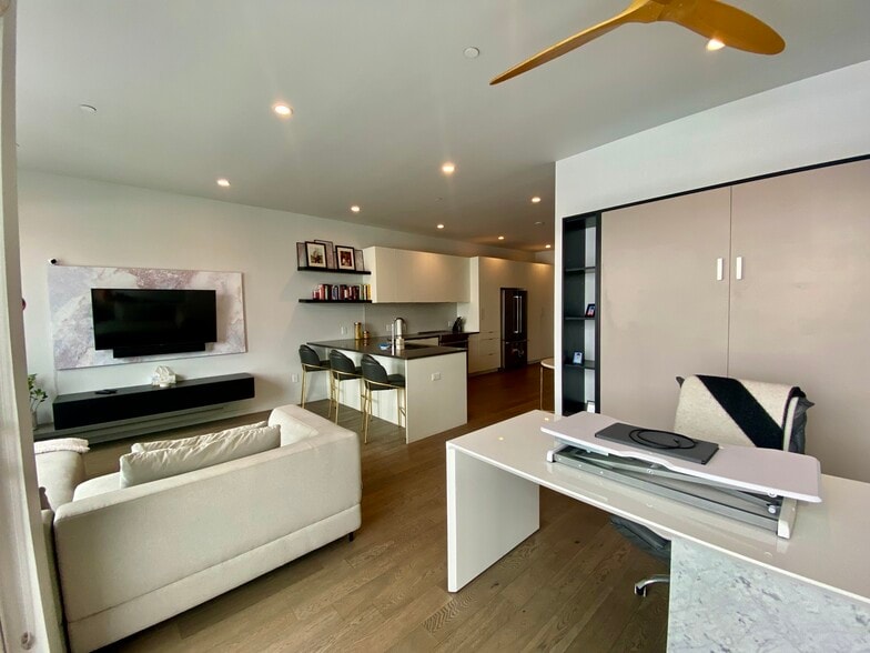 Lovely finishes include wide plank wood floors, stainless steel Kitchen Aid appliances, quartz countertops, subway tiled backsplash. Designated parking space in secure garage and storage (located on mezzanine floor) are available for monthly fee. Awesome rooftop deck complete with multiple tables, a lounge setup and a pet relief turfed space. New front door lock installed in 2023, new security cameras were installed in 2024 and open path security code for the elevator and front door entry.