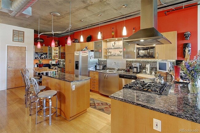 Contemporary, loft style, open floor plan condo overlooking the rocky mountains. Solid concrete constructions so it is extremely quiet. Chef's kitchen with gas burners/oven with extraordinary storage and adjacent bar with wine refrigerator. Double doors open to a spacious balcony that overlooks Cherry Creek, and comes with gas grill. Gas fireplace for those cooler evenings. Oversized bedroom with a sitting area, two huge closets, bath with shower, double vanity and whirlpool tub. Extra large room can be used as a TV room, den, dining room or second bedroom. Full second bath off living room. 24x7 concierge and work our facility, and one underground garage parking spot. Steps from Ball Arena, Union Station and a few blocks from the Ball park and 15th street mall. Super convenient location to everything downtown Denver has to offer. A must see! Owner pays all utilities except electric and cable/internet. Xcel typically runs less than $100 per month