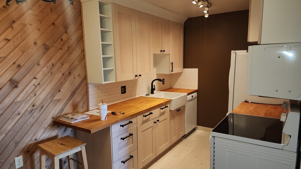 Updated kitchen with farm sink, new appliances, glass-top range, Bosch dishwasher, and butcher-block countertops
