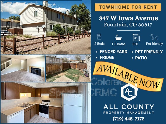 Move In Special!! $500 credit towards second month of rent to approved applicant. * 2 Bedrooms, 1 1/2 Bathrooms * Kitchen Equipped with Refrigerator, Electric Stove, Dishwasher and Eat In Area * Fenced in Back Patio * Washer and Dryer Hookups * Pet Friendly Upon entry you are greeted into the carpeted living room with a coat closet, and decorative fireplace. Around the corner is a half bathroom, followed by an open kitchen. Kitchen comes equipped with a refrigerator, electric stove, dishwasher, and eat in area for dining. Sliding glass door leads you to the enclosed back patio. Head upstairs and find a full sized bathroom, washer & dryer hookups, and two large bedrooms. Owner is working with the neighboring complex to have the parking lot repaired soon. Owner may consider up to two medium sized pets upon approval, with additional deposit and completed profile at Petscreening. *Please note, in order to receive the move in special, you must fulfill all terms of lease or the $500 will be billed back at the end of the lease term. The fireplace is not to be used, and is for decorative purposes only. Offered by All County® Colorado Springs, CRMC. Call us today, or see more of our properties by visiting us online. Please note, if approved for this property, the longest we can hold off before starting a lease is two weeks from the approval date, unless home is not move in ready at time of application approval. *Renter's Insurance is required upon execution of lease. All County® Colorado Springs, CRMC provides coverage options with a 3rd party vendor. Inquire within for more details. 11 Month Lease for initial residents This home is exclusively managed by All County® Colorado Springs, CRMC, a professional brokerage firm licensed by the state of Colorado. All County® Colorado Springs, CRMC is a dedicated fair housing advocate and does not discriminate based on race, color, national origin, religion, sex, familial status or handicap (disability), ancestry, marital status or creed, sexual orientation, source of income, hair style, and all other protected classes defined by fair housing. Reasonable accommodations or modifications will be made in rules, policies, practices, property or services when such accommodations may be necessary to afford a person with a disability the equal opportunity to use and enjoy the property Applicant has the right to provide All County Colorado Springs CRMC with a Portable Tenant Screening Report (PTSR) that is not more than 30 days old, as defined in 38-12-902(2.5), Colorado Revised Statutes; and 2) if Applicant provides All County Colorado Springs, CRMC with a PTSR, All County Colorado Springs CRMC is prohibited from: a) charging Applicant a rental application fee; or b) charging Applicant a fee for All County Colorado Springs, CRMC to access or use the PTSR.