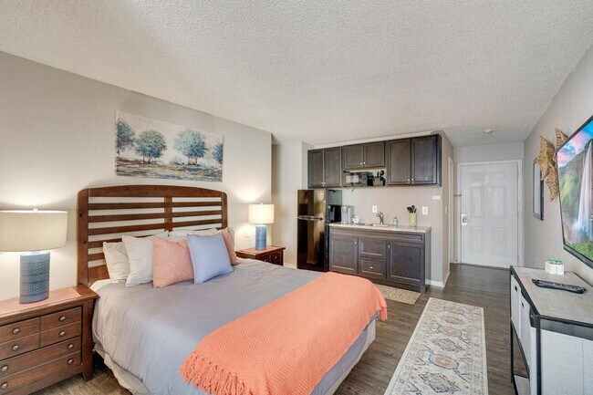 Feel at home in this perfect studio for your extended stay in Denver Tech Center. This condo is located on the first floor of the building and feels very much like a hotel suite, except with its own private entry direct from outside with no shared indoor hallway. This cozy and comfortable studio includes a kitchenette with a stainless fridge, microwave, sink, hot plate, coffee maker, small set of plates, bowls, cups, utensils, and basic pots and pans, suitable for light cooking only. It also features a good-sized bathroom with a single sink and tub/shower combo, and a walk-in closet. Amenities include Wi-Fi, free parking, cable, pool access, and a fitness center. Enjoy being within walking distance to shops and restaurants, and close to outdoor space. Located off of I-25 and Arapahoe, this studio is 4 minutes to Park Meadows Mall, 7 minutes to Cherry Creek State Park, 6.4 miles to Sky Ridge Medical Center, 8.6 miles to Kennedy Soccer Complex, 8 miles from the University of Denver, 15 miles from downtown Denver, and 28 miles from Denver Airport. The unit is not equipped for more than light cooking. Guests do not have access to the mailbox; a PO box is recommended. Amazon package and grocery delivery is permitted and comes to the door. No contact entry. Includes a dedicated desk for remote work. [SI]