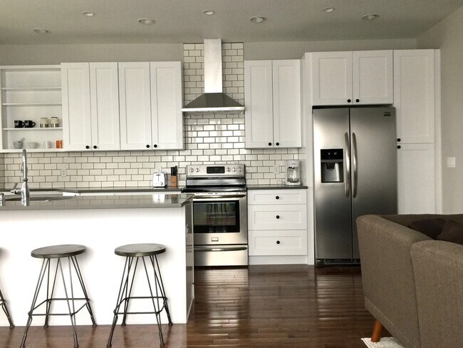 Quiet and centrally located neighborhood showcasing fantastic mountain views, spacious high ceilings full of natural light, hardwood floors and new appliances. Master bedroom features king size bed with on suite master bath and 90 sf walk-in closet with washer and dryer. Smart TVs in living room and bedroom. Single car garage included, driveway and readily available street parking. 6-12 month lease options.