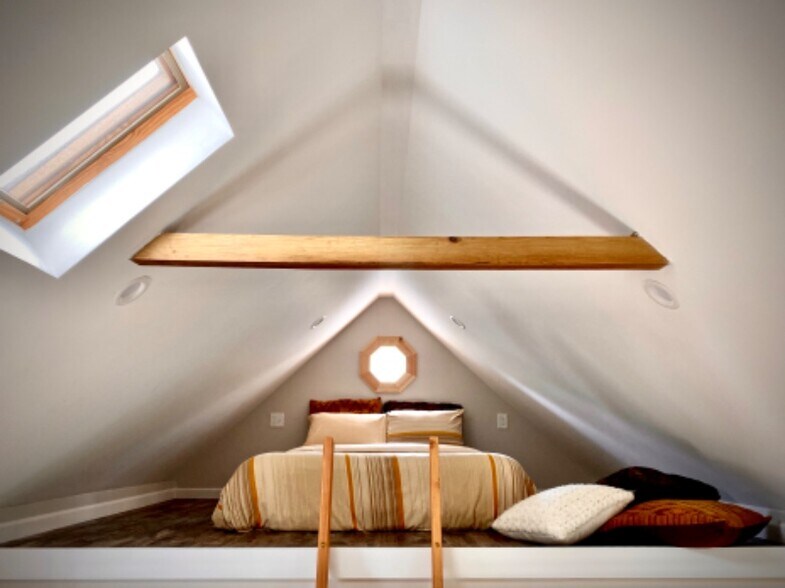 Tiny House. Custom kitchen with quartz counter tops, custom tile bathroom, custom woodwork throughout. Gas range with vented microwave. Stackable washer and dryer. Breakfast bar for two. Heat and A/C. Loft Bedroom with latter access and exposed beams. Skylight. Foam insulated walls. Very cozy and unique space. Designated parking and outdoor space. All utilities are included.