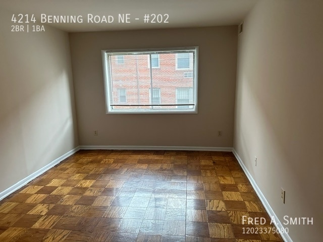 ---- SCHEDULE A SHOWING ONLINE AT: ---- Spacious Two-bedroom + porch apartment in well-maintained community off of Benning Road. Easy public-transportation access (Benning Rd Metro Station). Please call Demetria between 9am-6pm at to schedule a viewing of the unit. Once you have viewed you the unit you are more than welcome to complete an application at . Credit screening required with $50 application fee for all leaseholders over the age of 18. No Pets but service and companion animals welcome! Professionally Managed by: Fred A. Smith Company 730 24th St NW Suite 19 Washington, DC 20037 EHO