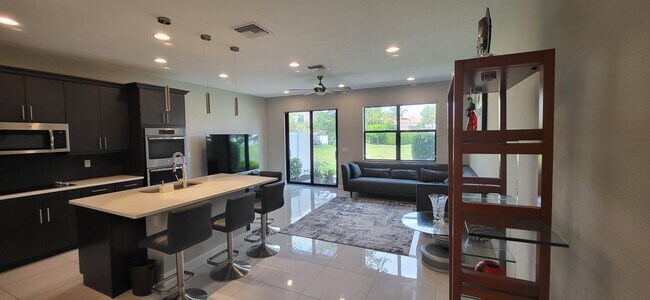 Check out this stunning new construction furnished townhome located in the exclusive Enclave gated community at Boca Dunes! This spacious 3 Bed, 2.5 Bath home with high ceilings boasts a beautiful kitchen featuring quartz countertops, stainless steel appliances, and a large island with seating. The open concept dining and living room with high ceilings offers amazing lake and pool views. The master suite includes a walk-in closet, luxury bath with double sinks, and an oversized shower. Other features include hurricane impact windows/doors and a convenient second-floor laundry room with brand new washer and dryer. 1-car garage and parking for 5 cars will provide enough parking for your guests. Enjoy the Florida sunshine in your lakefront back patio, perfect for entertaining. Resort-Style Amenities that include a Clubhouse, Pool, Heated-Spa, Billiards, Tot's Play Area, Walking Paths, State-of-the-Art Fitness Center. Top-Rated Schools with tons of shopping, restaurants and supermarkets.