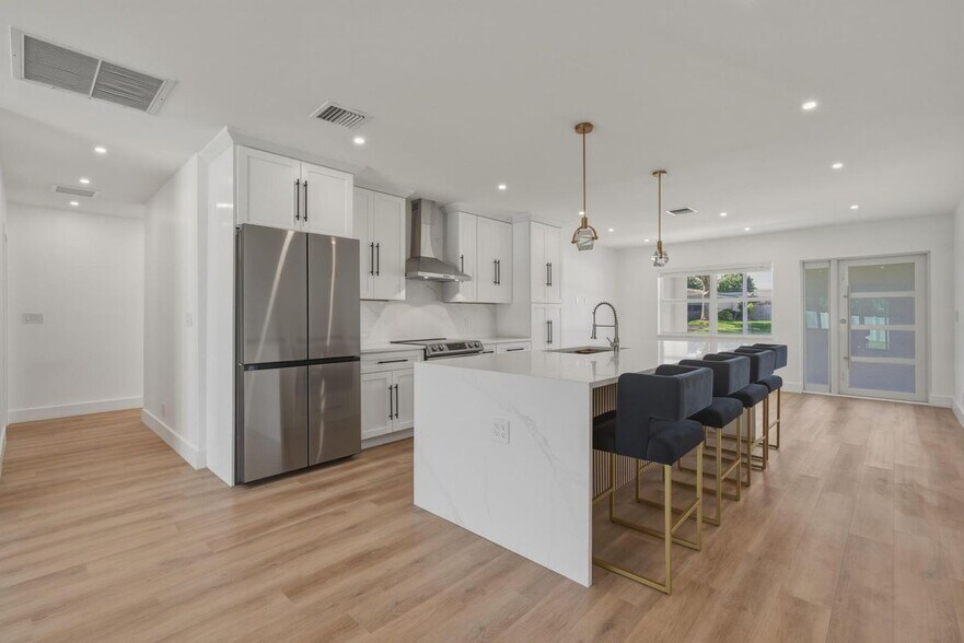 Experience coastal luxury in this pristine 3 Bed 2 Bath East Boca retreat. Designed for the sophisticated renter, the open-concept layout features dimmable lighting throughout and a chef's kitchen equipped with soft-close cabinetry, a microwave drawer, a commercial vent hood, and a range with a built-in air fryer. The oversized island boasts a hidden trash bin, while the fridge includes an auto-refill water pitcher. A dedicated laundry room features premium Maytag appliances. Located in the heart of downtown, you are steps from Mizner Park, the Boca Tennis Center, and elite dining/shopping. Enjoy peace of mind with the police and fire stations nearby, all while being just over a mile from Boca's world-class beaches. Luxury, convenience, and modern tech meet in this unbeatable location. Listing courtesy of Compass Florida, LLC.