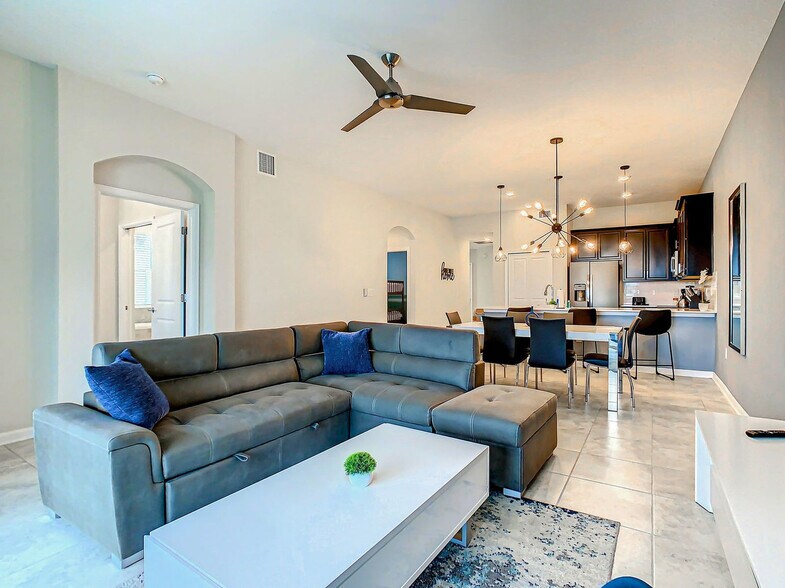 Experience the thrill of the new Epic Universe park, just minutes away from this spacious vacation condo at Champions Gate. Designed with the magic of Walt Disney World in mind, this condo offers a premium location and elegant style, making it an excellent choice for a family vacation. The property features a fully equipped kitchen, air conditioning, and a game room, ensuring you feel at home during your stay. Enjoy full complimentary access to the resort's amenities, including a gym, heated swimming pools, a lazy river, and a water park. The main clubhouse, Oasis Club, is just a 7-minute drive away and offers a variety of activities such as a spa center, golf, and a restaurant, some of which may require an additional fee. The condo itself is equipped with four smart TVs, a washer/dryer, and high-speed internet, providing all the comforts you need. Paid add-ons include access to the spa center, golf, and restaurant at the resort. Additional services such as Pack and Play, high chair, early check-in, and late check-out are available for an extra cost. Free parking is provided for your convenience. Located in the heart of Champions Gate, this condo is within walking distance of a clubhouse and just a short drive from major attractions like Disney World Magic Kingdom, Universal Studios, and Sea World. Nearby, you'll find a variety of shopping outlets, supermarkets, and local restaurants, ensuring convenience and entertainment are always at your fingertips. Transportation options like Uber and Lyft are readily available, making it easy to explore the area. Guests must be at least 18 years old to book a reservation. No unregistered guests, smoking, or pets are allowed inside the property. The condo features a side entry and utilizes keyless entry with a code provided prior to check-in. A safety protocol is in place to ensure the well-being of guests and personnel, and check-out care follows World Health Organization standards. To access the resort, guests must share a guest list to create and share QR codes, which is an unavoidable requirement. The condo offers high-speed internet, making it remote work-friendly. A laptop computer is not included, but the space is designed to accommodate your work-from-home needs. [SI]
