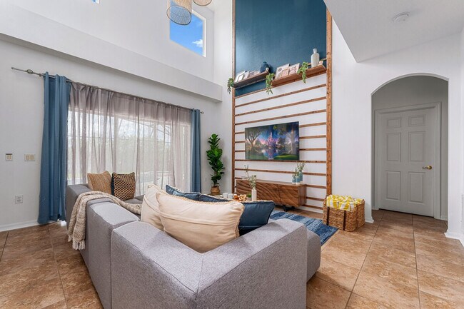 Feel at home in this villa in HighGate Park, just 8 miles from Disney. This spacious home accommodates 16 guests and features themed spaces inspired by Frozen, Avatar, and Guardians of the Galaxy. This villa features a Super Mario Kart-themed game room with glow-in-the-dark decor, an Xbox, an air hockey table, foosball, and arcade machines. The fully equipped kitchen has stainless steel appliances, pots, pans, and a two-in-one drip coffee/Keurig machine. There is also a washer and dryer for your convenience. For families with children, a high chair, stroller, baby gate, and kids' utensils are provided. Pool heat is available for $35 per day. Enjoy the Florida weather on the spacious lanai, featuring outdoor seating, a propane grill, and a private heated pool and spa. The dining room features a table that seats 12, plus an adjacent kitchen counter for 4, and an extra small table that seats 4, totaling 20 seats. The nearest supermarket, Walmart, is 3 miles away. This is a dog-friendly property that can accommodate up to 2 dogs (within the insurance policy's accepted breeds) for a $150 pet fee. Guests are responsible for refilling the BBQ propane tank. A maximum of three cars per reservation are permitted, and RVs, campers, or trailers are not allowed. [SI]