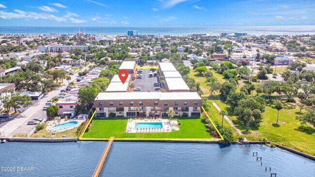 Beachside Condo on Halifax in Daytona Beach with an AMAZING riverfront pool. The kitchen includes newer stainless-steel appliances. The spacious living room is light and bright and features tile floors throughout. Both bedrooms are spacious and located on the second floor. The unit includes water,sewer,garbage,and lawn care. Laundry in the building on-site. Just blocks from the beach and close to transportation.