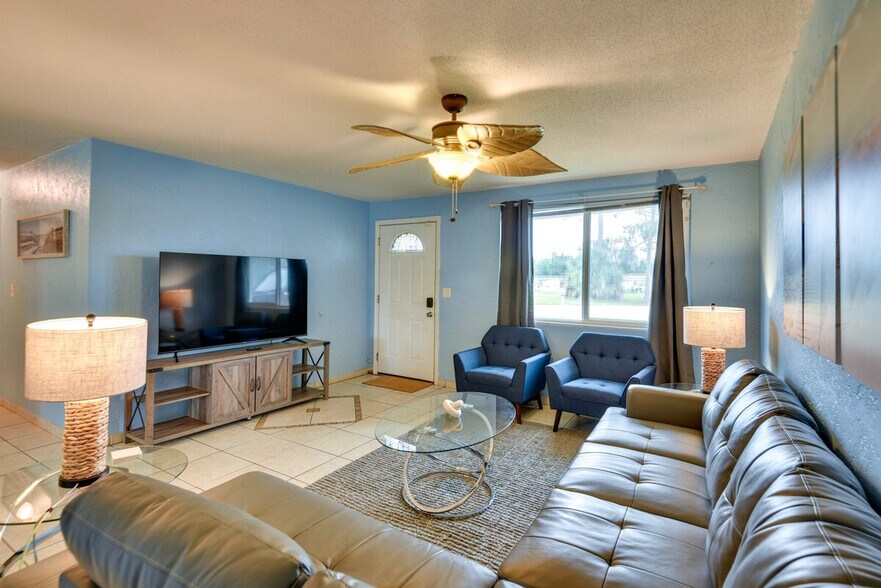 The advertised rate of $4,309/month is the lowest available price, based on a 30 day(s) stay with a move-in date of October 29, 2026. Rates vary depending on the duration of stay, season, and other parameters. For exact pricing and additional pricing components, please visit our website and enter your desired move-in and move-out dates. The rate is applicable when billed upfront; it can be higher if billed in multiple payments. Breezy beach days and fun-filled nights on the Daytona Boardwalk await at this sunny Daytona Beach home. Conveniently located near beaches and local attractions, this 3-bedroom, 2-bathroom vacation rental boasts a private pool, a screened-in patio, and a fenced-in yard. Spend your days strolling through Rockefeller Gardens, relaxing on the sandy shores at Daytona Beach, or riding jet skis at Florida Jet Ski Rentals. Return home to enjoy a homemade meal on the patio while watching the sunset. Newly renovated and designed with a laptop-friendly workspace, this home offers a screened-in patio for outdoor relaxation. The bedrooms include a California king bed, a queen bed, and a twin bunk bed with a twin trundle. Outdoor living features a pool, outdoor seating and dining, and a fenced-in yard. Indoors, you'll find smart TVs, a breakfast bar, a dining table, a walk-in shower, a shower/tub combo, a walk-in closet, and ceiling fans. The kitchen is fully equipped with a stove/oven, refrigerator, cooking basics, dishware/flatware, coffee maker, toaster, and blender. Parking is available with a garage for one vehicle, a driveway for two vehicles, and street parking on a first-come, first-served basis. Located near the vibrant Daytona Boardwalk, this home offers easy access to local attractions and beaches. Enjoy a stroll through Rockefeller Gardens or a day on the sandy shores of Daytona Beach. For adventure seekers, Florida Jet Ski Rentals is nearby for an exhilarating experience on the water. The property requires two exterior steps to enter and features a single-story interior. For your safety, there are two exterior security cameras facing outwards, ensuring privacy while recording video during your stay. The property has a no-smoking, no-pets, and no-parties policy. Guests must be at least 25 years old to book, and photo ID may be required upon check-in. Includes a laptop-friendly workspace, ensuring you can comfortably work from home with ease. [SI]