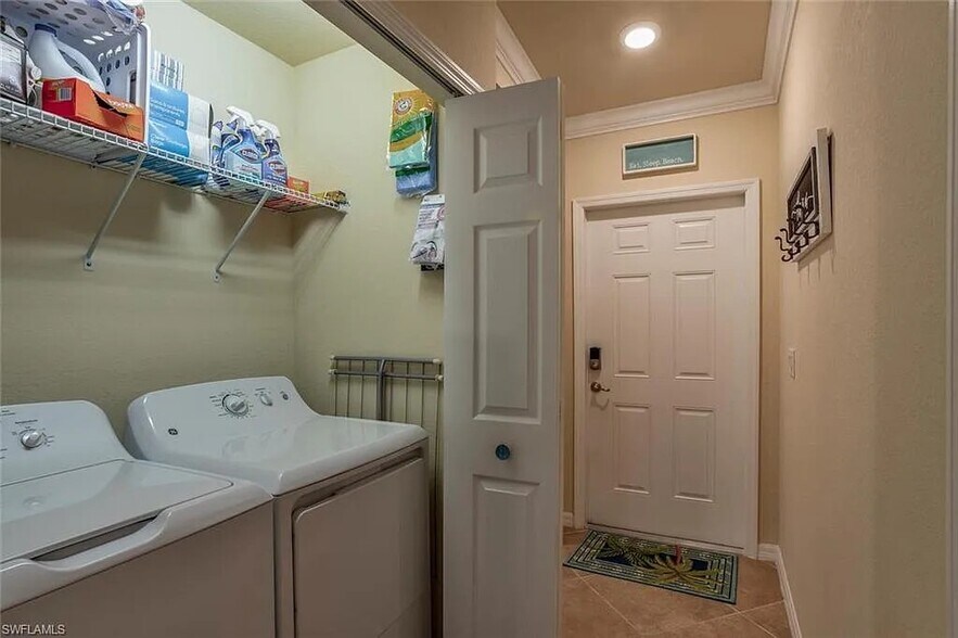 Beautifully decorated with inviting Florida décor, this 2BR + den, 2BA condo lives like a 3 bedroom plus office, offering flexible space for guests or working remotely. The open, spacious floor plan is ideal for everyday living and entertaining, featuring a granite kitchen with stainless steel appliances and bar seating. Enjoy true indoor-outdoor living with an oversized screened front porch and a large screened balcony overlooking lush greenery and palm trees, providing peaceful tropical views and additional living space. Includes assigned covered parking and impact windows. Gated community amenities feature a pool, clubhouse, fitness center, and BBQ area. Conveniently located near Gulf beaches, shopping, and dining.