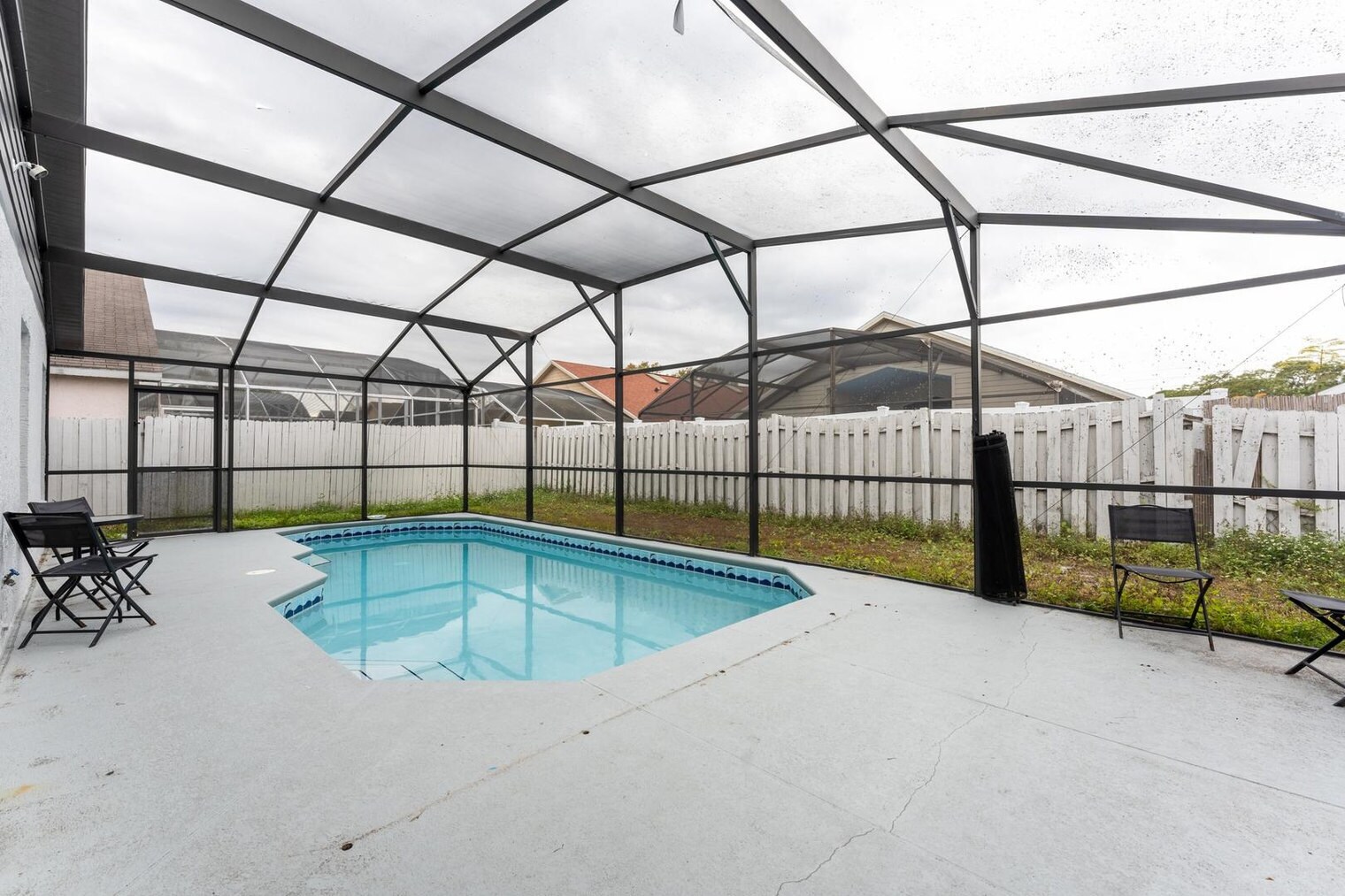 Feel at home in this stylish 4-bedroom, 2-bathroom home with an open floor plan. Nestled in a quiet community with a conservation area and lake, this home is perfect for a family or group stay. The home features an open-concept living room with a Smart TV, a dining area, and a fully equipped kitchen. Enjoy central A/C, ceiling fans, and high-speed Wi-Fi that supports up to 10 devices. There is also a private screened pool and outdoor dining porch. Early check-in and late check-out are available for $50 each, subject to availability. Located just 20 minutes from theme parks and near highways, shops, and dining, this home offers convenience and relaxation. Parties are fully prohibited. Quiet time is from 10 PM to 6 AM. There is a $300 penalty for smoking on the property, and you will be dismissed from your rental without a refund. There is a $250 penalty if noise level, parties, or other obscene behavior requires a police callout, and you will also be dismissed from the property without a refund. There is a $100 penalty for leaving trash outside the entrance to your property. Once your trash cans are full, please deposit trash in the large trash cans located at the building entrance. Do not throw trash, paper towels, or toilet paper in the toilet to avoid clogging; please use the trash can. Damage to the interior of the property or common areas will result in a pro-rated auto-chargeback from your booking account. On checkout, please turn off the lights, the A/C unit, water, and gas/stove, and lock the door behind you. Check-in is any time after 4 PM, and check-out is at 10 AM. A late check-out without authorization will lead to a night-rate cost penalty that could be deducted from your booking account. [SI]