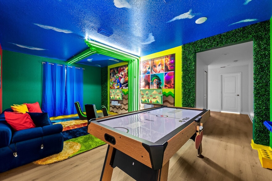 The advertised rate of $11,257/month is the lowest available price, based on a 30 day(s) stay with a move-in date of October 10, 2026. Rates vary depending on the duration of stay, season, and other parameters. For exact pricing and additional pricing components, please visit our website and enter your desired move-in and move-out dates. The rate is applicable when billed upfront; it can be higher if billed in multiple payments. Feel at home in this Storey Lake Resort home, just 7 miles from Disney. This home sleeps 18 and features 6 bedrooms. This family retreat features a Disney Villains movie theater with a 4K projector, reclining chairs, and Dolby 5.1 surround sound, and a Super Mario Bros game room with air hockey, ping pong, a Lego wall, and 2 Xbox 360 consoles. The fully equipped kitchen includes modern appliances, a microwave, toaster, blender, coffee machine, and all essentials. Enjoy the spacious living room with a plush sectional and 75" Smart TV, and a dining area that seats 8, plus 4 at the kitchen island. There are also in-unit washers and dryers, and central A/C and heating. Pool heat for the private heated pool and spa is available for $35 per day. Up to 2 dogs are welcome (within insurance-approved breeds) for a $150 pet fee. Guests are responsible for refilling the BBQ propane tank as needed. Walk to the Storey Lake Clubhouse with its water park and lazy river. This home is minutes from Disney (8 mi), Universal (15 mi), and SeaWorld (10 mi). Guests are responsible for refilling the BBQ propane tank as needed during their stay. Please keep pets leashed outside, crate them if left unattended, and be sure to clean up after them. During the winter season (Dec 21 - Mar 20), if the external temperature is too low, the pool heating may not reach expected levels. Travel insurance is highly recommended, especially during Florida's Hurricane Season (June 1 - November 30). Includes a dedicated workspace perfect for remote work. [SI]