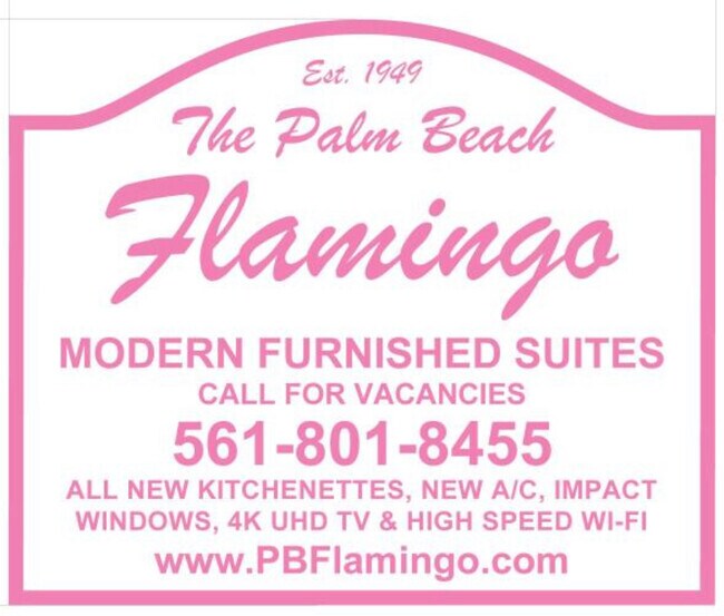 FULLY FURNISHED STUDIOS AT THE PALM BEACH FLAMINGO Everything is BRAND NEW in these fully furnished studio suites. The Palm Beach Flamingo is ideally located on the border of West Palm Beach and Lake Worth Beach directly between I-95 and the waterfront near public transportation and surrounded by retail plazas. All units have been completely renovated with a mid-century modern retro look, with red Galanz refrigerators and microwaves. All units come with 4K UHD televisions and high speed Wi-Fi from dedicated fiber optic internet with new air conditioning and hurricane impact windows throughout. There is a courtyard with a picnic table and BBQ. The property is upscale and professionally managed. All units are NON-SMOKING and NO PETS. $55 flat monthly fee for ALL utilities. $30 for assigned parking (optional).