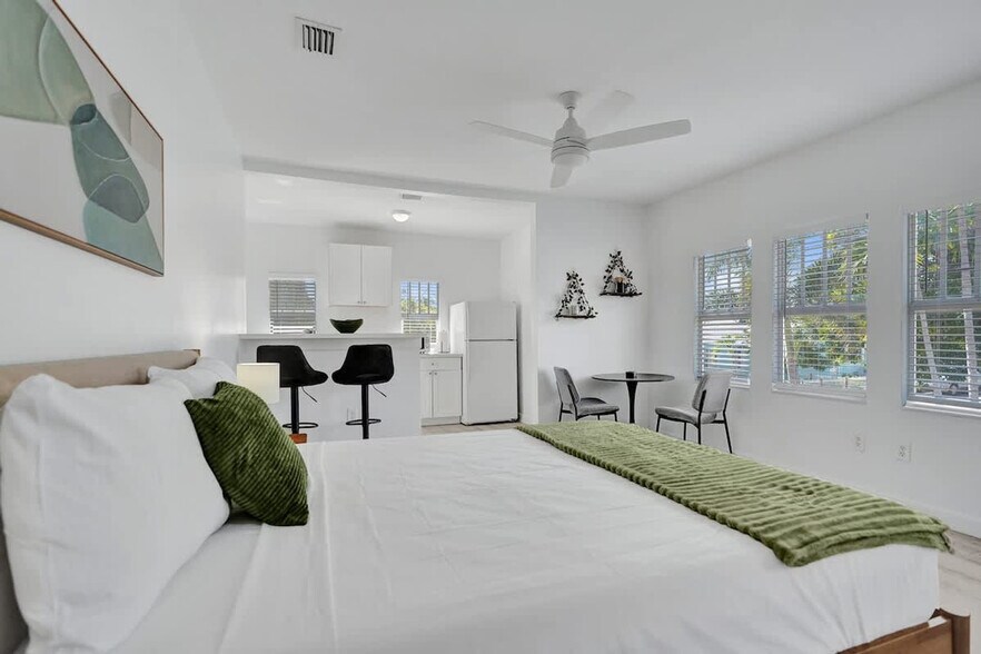 The advertised rate of $2,905/month is the lowest available price, based on a 30 day(s) stay with a move-in date of May 13, 2026. Rates vary depending on the duration of stay, season, and other parameters. For exact pricing and additional pricing components, please visit our website and enter your desired move-in and move-out dates. The rate is applicable when billed upfront; it can be higher if billed in multiple payments. Enjoy this bright second-floor studio and feel at home. Perfect for couples or solo travelers, this studio is just minutes from Lake Worth Beach and downtown. This modern studio offers a queen bed with premium linens and soft lighting, a Smart TV with streaming access, and high-speed Wi-Fi. The full kitchen includes a refrigerator, stove, oven, microwave, and coffee maker. There is also a dining table for meals or workspace and a modern bathroom with a walk-in shower, clean towels, and starter toiletries. Enjoy the shared pool with tropical landscaping and lounge seating, and the covered outdoor bar area with shaded seating for relaxation. Poolside tables and chairs are perfect for morning coffee or evening drinks. Pets are allowed for an additional fee and must be requested in advance (under 50 lbs). This studio is minutes from Lake Worth Beach and the historic Pier. Walk or drive to Downtown Lake Worth’s cafés, shops, and art galleries. Great nearby dining options include Benny’s on the Beach, Rustico Ristorante, and Toojay’s Deli. There is easy access to I-95, Palm Beach Island, and Downtown West Palm Beach. Quiet hours are from 10:00 PM to 9:00 AM. No parties, gatherings, or events are allowed, and violations will result in a $500 fine and immediate removal without refund. No indoor smoking (includes cigarettes, vaping, hookah, cigars, or cannabis) is allowed; outdoor smoking is permitted at least 10 feet from the building, with doors and windows closed, and violations will result in a $500 fine and may result in immediate cancellation without refund. Check-in is at 4:00 PM or later. Any noise complaint may result in a $500 fine and/or cancellation without refund. A $500 fine will be assessed for parking violations, and the violation may result in immediate cancellation without refund. A $1,000 fine will be assessed for unplugging, moving, or tampering with cameras or any connected devices, and may result in immediate cancellation without refund. Please note that the partner will place a $350 refundable authorization hold on a credit or debit card about 72 hours before arrival for security. If damages or policy violations occur, related charges may apply; otherwise, the hold is released after checkout and processed within 5-7 business days. [SI]