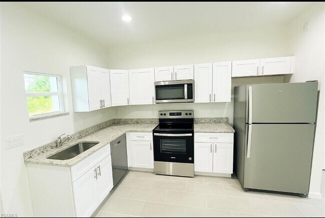 Welcome to this modern 2-bedroom, 1-bathroom, 1 car garage new construction home located in the vibrant community of Lehigh Acres, FL. Nestled in a peaceful residential neighborhood, this home offers the perfect blend of privacy and convenience. The eat-in kitchen features stainless steel appliances and granite countertops, complemented by sleek tile flooring throughout. A one-car garage provides secure parking and extra storage, while the washer and dryer hook-up adds everyday ease. Enjoy the spacious quarter-acre lot with an open front porch and covered rear lanai—ideal for relaxing or entertaining. The large backyard is ready for your personal touch. Impact windows offer storm protection and peace of mind. Pets are welcome, making this a perfect home for all members of your household. Located just minutes from local schools, shopping centers, parks, and major roadways, this property places you close to everything Lehigh Acres has to offer. Listed by: Best Investing Realty Listing posted by Linda Castanon [SYNDID 4146181 12172025]