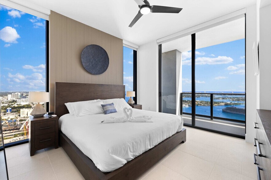 The advertised rate of $15,099/month is the lowest available price, based on a 30 day(s) stay with a move-in date of August 16, 2026. Rates vary depending on the duration of stay, season, and other parameters. For exact pricing and additional pricing components, please visit our website and enter your desired move-in and move-out dates. The rate is applicable when billed upfront; it can be higher if billed in multiple payments. Elevate your stay in this spectacular 3-bedroom penthouse, perched high above Downtown Miami. With soaring ceilings, elegant design, and floor-to-ceiling windows, this apartment creates a sense of space and sophistication. Enjoy breathtaking panoramic views of Biscayne Bay and the city skyline from every room, and feel at home whether you're relaxing in the expansive living area or waking up to sunrise views. Enjoy luxury and comfort in this 3-bedroom apartment in downtown Miami. The master bedroom features a king-size bed, TV, private balcony, and en-suite bathroom for your own peaceful retreat. The second bedroom offers a cozy queen bed with a TV and lots of natural light, while the third bedroom includes two twin beds and a TV, great for kids or extra guests. The spacious living room includes a king-size sofa bed, big TV, and dining table for six people. The fully equipped kitchen boasts modern appliances, including a Wolf stove, SubZero fridge, and coffee machine, providing all you need to cook. Elegant bathrooms with luxury fixtures, walk-in showers, and premium toiletries offer a refreshing experience. High-speed Wi-Fi keeps you connected for work or fun. Guests can enjoy the convenience of free parking located just a short walk from the building, ideal for easy access without additional costs. Valet parking is available with rates of $43 for 0-4 hours and $75 for 4-24 hours, with an additional $15 fee for oversized vehicles. Spa and wellness services are available at an additional cost. A daily resort fee of $37.45 applies and must be paid at the front desk during check-in, with only credit card payments accepted. This apartment offers walkable access to Miami’s top attractions. Bayside Marketplace is just 0.3 miles away, offering shopping, waterfront dining, and live entertainment. Bayfront Park, also 0.3 miles away, is a scenic spot for yoga, food festivals, and major events like the Ultra Music Festival. The Kaseya Center, home of the Miami Heat and a venue for concerts and performances, is 0.4 miles away. Museum Park, 0.5 miles away, features the Pérez Art Museum and the Frost Science Museum. PortMiami is just 1 mile away, ideal for pre- or post-cruise stays. Brickell, Miami’s sleek financial district, is 1.5 miles away, filled with fine dining, rooftop bars, and luxury shopping. South Beach is a quick ride, just 5 miles away, offering white-sand beaches, iconic Art Deco streets, and nonstop nightlife. The Miami Worldcenter, Adrienne Arsht Center, and Miami Convention Center are also nearby, making this location unbeatable for experiencing the ultimate Miami lifestyle. Check-in is available until 12 AM, with an early check-in option subject to availability and an additional fee. The property is smoke-free, with smoking strictly prohibited inside the unit and on the balcony, and violations may result in severe fines. Quiet hours are from 10:00 PM to 8:00 AM. All guests must be registered, with full names and IDs provided at check-in. Reservations must be made by someone 21 years or older, and the reservation holder must be present throughout the stay. Standard check-in is at 4:00 PM, and check-out is at 11:00 AM. Late check-out until 12:00 PM is available for an additional $50, subject to availability. Damages to the apartment will result in additional charges. The apartment is equipped with high-speed Wi-Fi, making it easy to stay connected for work or fun. [SI]