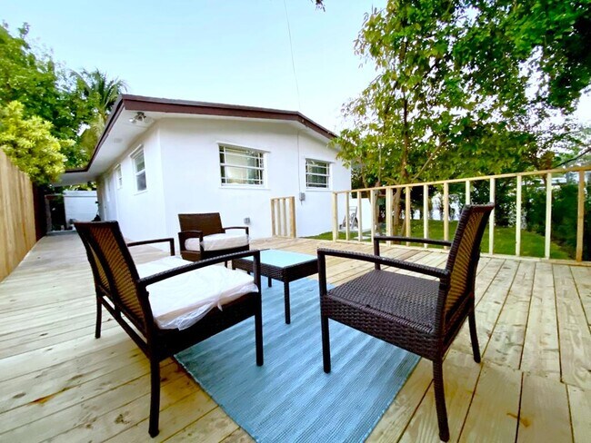 Beautiful furnished 3 bedroom / 2 bath home with wooden deck leading to the back yard. Home is renovated with washer and dryer in unit. Plenty of parking spaces on property. Home is completely fenced all around. Close to schools, hospitals and airport. Wynwood area.