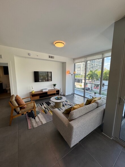 This modern residence features an open layout with sleek finishes, including quartz countertops, stainless steel appliances, and elegant tile flooring. Offering the convenience of an in-unit washer and dryer, spacious walk-in closet, blackout shades, and private balcony with stunning views.