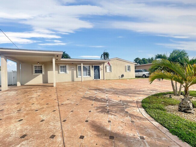 Fully renovated 3-bed, 2-bath single-family home for annual lease. Beautiful kitchen features rich wood cabinets, massive island, stainless steel appliances, & granite countertops. Stunning, oversized tile & gorgeous window treatments adorn entire home. Primary bath has double vanity with modern glass countertop, & a shower/tub combo. Bath 2 shines with floating vanity, quartz countertops, shower with custom tile work. Over 1/2 acre fenced-in lot with paved, covered back patio & canal views is perfect for entertaining. Complete accordion shutters, decorative, circular driveway, & attached carport provide ample parking & complement the stunning exterior. Move-In Ready. Income must be 3xrent, background/credit/eviction check required. Pet may be considered.