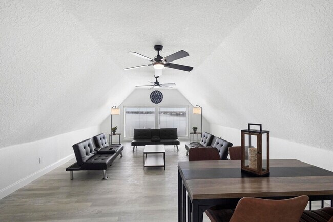 Feel at home in this spacious 3-bedroom unit, located on the second floor of a quiet Oviedo quadruplex. This home features a private entrance, making it ideal for families or groups. This home features a kitchen equipped with a two-burner stove, air fryer, slow cooker, and refrigerator. There are spacious living and dining areas, and access to a shared washer and dryer. Enjoy the shared, fully fenced patio area. This is a pet-friendly property with a fee that applies. Parking is free and shared with other guests, limited to 2 compact cars per unit. Centrally located, this home is just minutes away from top attractions, restaurants, and shopping centers. Oviedo on the Park is a short drive away, offering walking trails, playgrounds, and a scenic lake. Black Hammock Adventures and Lukas Nursery & Butterfly Encounter are also nearby. Downtown Orlando is just 20 minutes away, and the Central Florida Zoo & Botanical Gardens is about 30 minutes away. As this is a multi-unit property, you may occasionally hear some noise from neighbors in adjacent units. Please respect quiet hours after dark to ensure a peaceful environment for all guests and neighbors. Smoking inside the property is strictly prohibited and will result in an automatic complaint. Max 2 pets are allowed. A pet fee of $60 (less than 100 lbs) or $250 (1+ month stay) applies for extra cleaning and bedding changes. Owners are liable for damages. Quiet hours are from 10 PM to 8 AM. Please keep noise to a minimum. For those who need to stay connected, a comfortable workspace is provided. [SI]