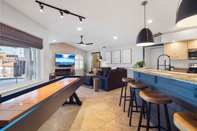 Welcome to Casa Canal, a stunning newly renovated vacation rental with an in-ground pool and spa, situated on the picturesque waterfront. This 4-bedroom, 3-bathroom property offers a perfect blend of luxury, comfort, and recreational amenities, ensuring an unforgettable stay for you and your loved ones. With its convenient location, you can easily visit St. Augustine, Daytona, Jacksonville, and Orlando. The spacious dining room accommodates 10 people, and the luxurious master suite features a king-size bed and a work-from-home station. The large open kitchen is equipped with stainless steel appliances and granite countertops, while the heated in-ground pool and spa with cascading waterfalls add to the allure. The property also includes a boat dock with a lift, kayaks, and bikes for your enjoyment. As you step inside, you'll be greeted by a beautifully designed interior that combines modern elegance with coastal charm. The formal living room features a comfortable couch and a large internet TV, perfect for unwinding and enjoying your favorite shows. The master suite offers a luxurious king-size bed and a work-from-home station, while three additional guest bedrooms provide ample accommodation. One guest bedroom includes a queen-size bed, the third bedroom has a large bunk bed with a full-size lower and twin upper, and the fourth bedroom comes with its own bathroom, also serving as a pool bath. The interior boasts a spacious dining area accommodating 10 people, a large open kitchen with stainless steel appliances, granite countertops, and a bar seating area. An adjacent family room with a spacious sectional and large flat-screen TV, along with a cozy electric fireplace, creates an inviting atmosphere. Upgrade to have the pool heated for an additional $287 weekly rate. A pet fee is $100 per pet per stay. The pool heater is available for $50 per day or $287 per week or $200 weekly for multi-week stays. If you plan to bring a trailer or RV, secure off-site parking is available approximately 7-10 miles from the property for $25 per day per unit. If you’d like to reserve a space, please let us know prior to your arrival so we can add it to your reservation and provide you with the access code. Casa Canal offers convenient access to the nearby European village, where you can explore a variety of restaurants, eateries, and entertainment options. Within half a mile from the property, you'll find miles of walking and biking trails, perfect for outdoor enthusiasts. Beautiful beaches are also within reach, offering free parking, bathroom facilities, and showers for your convenience. With its close proximity to St. Augustine, Daytona, Jacksonville, and Orlando, Casa Canal serves as an ideal base for exploring the surrounding areas. Whether you're seeking relaxation by the pool, adventure on the water, or exploring the vibrant nearby cities, this vacation rental promises an unforgettable experience. Quiet hours are between 22:00 and 7:00. Due to city regulations, trailers and RVs are not permitted to be parked at any city properties, and parking on the lawn or city swales is strictly prohibited at all times. All vehicles must be parked in the driveway only. If you plan to bring a trailer or RV, secure off-site parking is available approximately 7-10 miles from the property for $25 per day. If you’d like to reserve a space, please let us know prior to your arrival so we can add it to your reservation and provide you with the access code. The master suite includes a work-from-home station, providing a comfortable and efficient space for remote work. [SI]