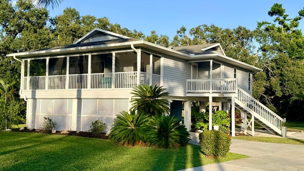 kayaks, and an expansive double lot with mature oaks. Exterior amenities include