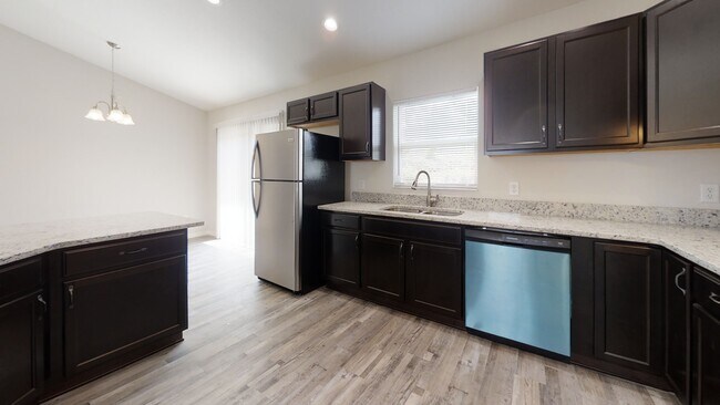 Contemporary Home. Experience luxury living with this modern new home, featuring an open floor plan with vinyl plank wood flooring throughout. The gourmet kitchen is fully equipped with stainless steel appliances, granite countertops, ample cabinet space, and a breakfast bar that opens into the family room. The home's split bedroom design provides a private Master suite with a bathroom on one side, while two spacious bedrooms with a shared bathroom are located on the other side. Don't miss out on the chance to tour this beautiful home!