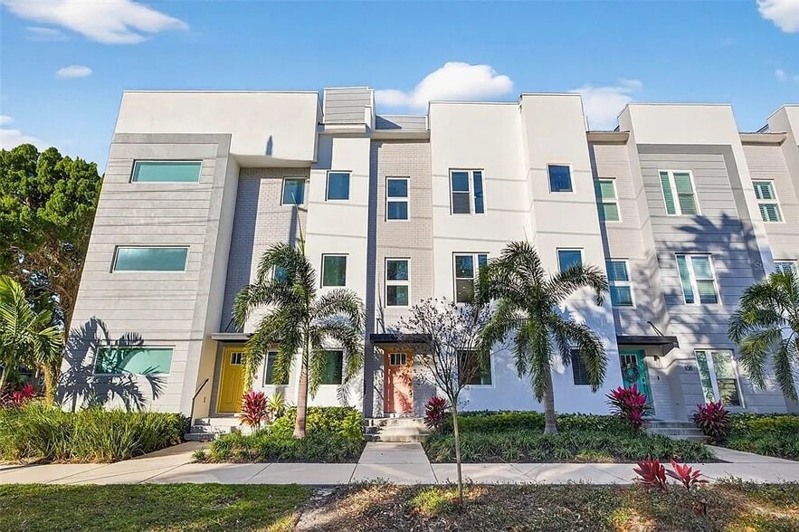 Welcome to 104 26th St N, a sophisticated four-story townhome completed in 2022 that offers contemporary luxury and effortless urban living in one of St. Petersburg's most vibrant locations. Built with solid block construction and situated in a non-flood zone, this exceptional residence combines refined design with peace of mind. Spanning three beautifully designed levels of interior living space and topped with a private rooftop deck, this home is ideal for elevated entertaining and everyday comfort. From the moment you step inside, you're greeted by soaring ceilings, wide-plank luxury LVP flooring, recessed LED lighting, and abundant natural light that create a clean, modern aesthetic throughout. The chef's kitchen serves as the centerpiece of the home, featuring soft-close shaker cabinetry, quartz countertops, and a premium KitchenAid stainless steel appliance suite. A stunning picture window fills the space with sunlight, giving the kitchen an open, airy feel that is perfect for both relaxed mornings and hosting guests. The private living spaces are equally well-appointed, with custom closet systems throughout, designer window treatments, and thoughtful functionality at every turn. Everyday convenience is enhanced with a Samsung washer and dryer, security doorbell system, and smart-home features throughout the residence. The oversized one-car garage offers exceptional storage and functionality, complete with overhead storage, a MyQ smart garage door, and a dedicated EV charging station.