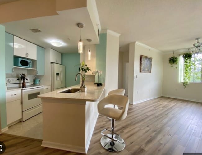 Location Location Location! Available 8/1/2025. Welcome to the gated resort-style community of Las Palmas and this move-in-ready 2 bedroom 2 bathroom condo! Live like you're on vacation everyday in this amenity rich community which features 2 swimming pools, hot tub, fitness center, billiard room, grilling areas, outside bar, tennis court, walking/biking trails, and then head just 1 mile down the road to University Town Center for endless shopping and dining. This open floor plan condo has been renovated, new floors (no more carpet, nice wood floors) and freshly painted, features volume ceilings with crown molding. The kitchen is modern with Euro, shiny cabinets and quartz countertops, tile backsplash and a breakfast bar. With a split bedroom layout, the master suite boasts a spacious walk-in closet, and en-suite bathroom. The lanai, just off the living room, is the perfect spot to enjoy morning coffee or a meal, while taking in views of the pool and lushly landscaped grounds. Location is prime with a private entrance to Nathan Benderson Park which offers a 600 acre park and 400 acre lake for walking, jogging, biking, and paddle boarding, or enjoy the many events held there. Mote Aquarium, bigger in FL opening in two months, 10 min walk, or drive 3 min. This condo is conveniently located within minutes to I-75, Lakewood Ranch, golf courses, beautiful Gulf Coast beaches, and Downtown Sarasota! Available August 1st. This a No Smoking condo. Application and approval by HOA is required,$100. 3rd floor unit only two flights up, good daily exercise . Only good credit tenants need to apply.