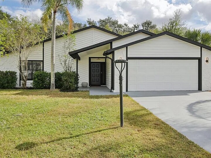 Welcome to this beautifully updated 4-bedroom home in the desirable Eastpointe community of Sarasota. Freshly renewed inside and out, this property blends modern style with everyday comfort in one of the area’s most convenient locations. The exterior features brand-new professional paint, giving the home crisp, modern curb appeal. A long driveway leads to the covered entryway with sleek black accents and mature landscaping. Inside, soaring ceilings in the spacious open living area create an inviting atmosphere. The living room is anchored by a floor-to-ceiling stone fireplace with rich wood accents, complemented by updated luxury flooring throughout. The primary suite is impressively spacious with room for a sitting area, a statement chandelier, and large windows that fill the room with natural light. The primary bathroom is a true luxury retreat, featuring floor-to-ceiling marble-style tile, a floating double vanity with LED backlit mirror, gold fixtures, a frameless rainfall shower and a freestanding soaking tub. Step outside to a fully fenced yard and a screened-in lanai perfect for relaxing, entertaining, or enjoying quiet Florida evenings. LOCATION, LOCATION, LOCATION This home is situated near some of Sarasota’s most desirable amenities: 5–7 minutes to UTC Mall, with endless dining, shopping, and entertainment Minutes to the new Mote SEA Aquarium at UTC — a major attraction and local highlight Close to Target, Whole Foods, Cooper’s Hawk, The Mall at UTC, and Nathan Benderson Park Easy access to I-75, making commuting simple Short drive to Sarasota’s world-famous beaches Additional features you’ll love: Updated flooring throughout Fresh exterior paint Enormous primary bedroom Luxury spa-style primary bath Fully fenced yard with screened lanai Long driveway with ample parking Move-in ready This home offers the perfect blend of modern upgrades, comfortable living, and unbeatable convenience. A must-see!
