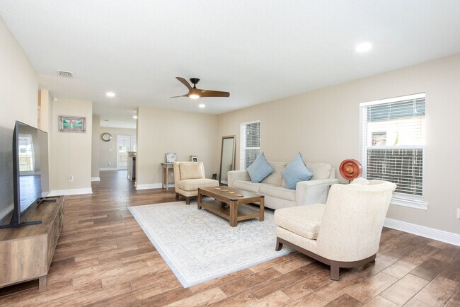 Located in the neighborhood of Seminole Heights, the area offers tranquility within central Tampa. This charming single-story house located in East Seminole Heights offers cozy and warm ambient peaceful living in the heart of Tampa! With over 1500 square feet, this bungalow has two bedrooms, two full bathrooms, and a dedicated office space. Perfect for traveling professionals, designed to offer the perfect balance of comfort and convenience in mind, in a stylish and stress-free living space. The primary bedroom suite has a queen bed, side table with power charge, full size dresser, Samsung Smart TV, ceiling light fans, black-out curtains, walk-in closet, and private bathroom/shower with a long vanity. The guest bedroom has a queen bed, full size dresser, closet, black-out curtains, and a ceiling light fan. There are two full size bathrooms with one located in the primary suite and other is a guest bathroom with tub/shower and single vanity. Linen closet in lighted hall with bed lines and towels. The living room offers ample space for entertainment and cozy relaxation with a 65 inch Samsung Smart TV, plush sofa-sleeper, accent chairs, side table with power charger, floor lamp, desk/table, and a modern remote-controlled ceiling fan. Kitchen and dining room is an open floor plan with plenty of cabinet space and a large pantry. The kitchen is fully equipped/stocked with full-size fridge, microwave, stove with oven, Cusinart toaster/air-fryer/coffee-maker, knives, blender, pots and pans, plates, glasses, etc. The kitchen also has a breakfast bar countertop with two stools and opens up to dining area with table and 4 chairs. Perfect for dining entertainment! The dedicated office space is equipped with a 6 feet modern desk, desk chair, surge protector, computer monitor, desk light, Frontier WiFi, ceiling light fan, small closet. Outside, the front porch has outdoor furniture seating, security camera, carport and driveway. The spacious backyard space is fenced in with palm trees and sitting area for those calm nights under the Tampa night sky. With a short 40-minute distance to beaches for some sunbathing and water-sports or kayaking in Wekiwa Springs or minutes from Hillsborough River, this home centers you in the heart of Tampa.