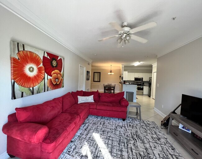 Come see this FURNISHED 2 Bedroom 2 bathroom water front condo in a very nice and gated community! Tile flooring in the living room and laminate in the bedrooms with a walk in closet in both. Both bathrooms are attached to the respective bedrooms with one having a second entrance to the living room. This unit has a screened in balcony and includes a washer and dryer and 2 parking spots (one covered and one uncovered. Community features a pool, pool tables, fitness center, and half a mile boardwalk. Dogs allowed with HOA breed restrictions. Owner pays HOA and parking fees. Tenant pays for electric, water, and internet