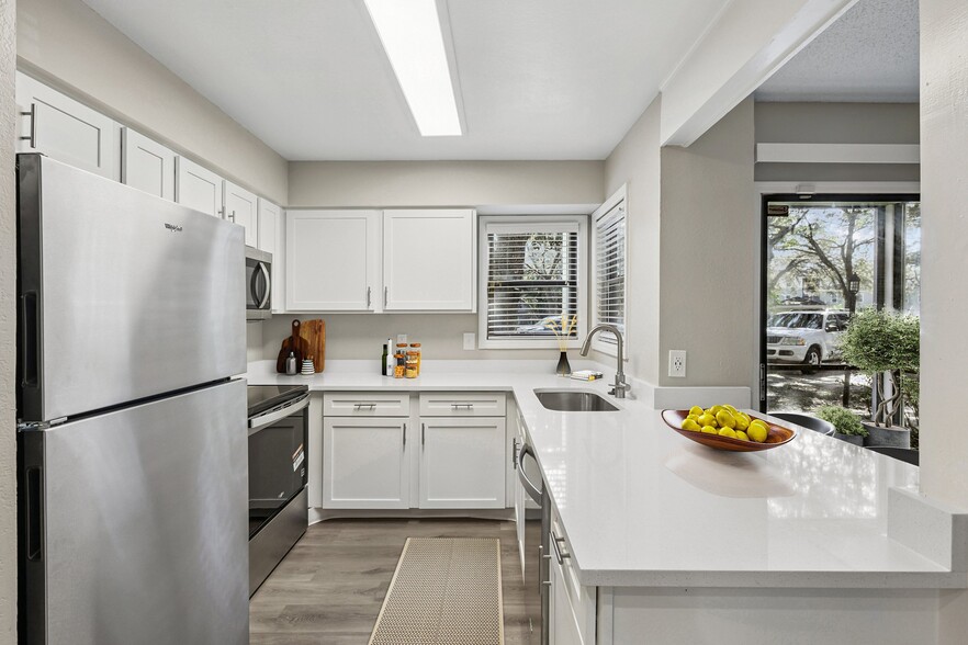 Experience culinary excellence in a fully furnished kitchen featuring elegant granite-style countertops, modern stainless steel appliances, corner windows, and a charming breakfast bar at Oak Ramble Apartments. Enjoy the beautiful lake views or serene wooded landscapes from the cozy haven of your screened-in patio or balcony. The sophisticated hardwood-style flooring, high vaulted ceilings, expansive oversized windows, spacious walk-in closets, and integrated smart home technology combine to offer you a comfortable lifestyle in a prime location at the heart of the region's finest attractions. Conclude a long day by strolling along our picturesque wooded trails or witnessing the sun's graceful descent behind our catch-and-release lake.