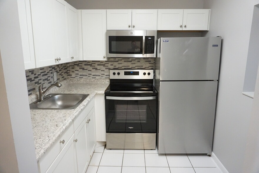 Totally updated 1bed/1bath FIRST FLOOR condo. This excellent unit features ceramic tile floors throughout and an updated bathroom with new vanity. Modern kitchen with stainless appliances. Large bedroom with good closets space with a patio. Century Village is a 55+ community with so much to offer...shows, movies, clubs, pools, security, and transportation service. The Clubhouse features a theater, indoor pool, card room, community/party room, billiard room, shuffleboard, tennis, pickle ball, bocce, and two outdoor pools. Separate fitness center with gym. Two guarded gates and 24-hour roving security patrol.