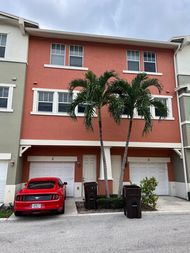 Luxury Resort Style 2 Bedroom 2.5 Bath apartment w/ large Den and 1 car Garage for rent in gated community with 24hr security. 3 Floor townhouse with high ceilings throughout. Beautiful newly renovated kitchen with Granite countertops and Ceramic Backsplash. Large new appliances and deep sink w/ garbage disposal. Includes water, trash removal, cable TV, Wi-Fi, gym, pool. Electric not included. Perfect Location right next to I-95, Outlet Shopping Center, Target/Whole Foods and 7 minutes from downtown WPB. 10 minutes from Beautiful Palm Beach. Open floor plan with Living Room, Dining area & kitchen on 2nd floor. Half bath on 2nd floor. Beautiful mural of West Palm Beach Inner Coastal city skyline on living room wall. Den located on 1st floor. Could be used as guest/children living space but is not closed off. Master bedroom on the 3rd Floor includes full bath w/ stand up shower. 2nd bedroom on 3rd floor with detached full bathroom and tub. Washing machine/dryer in 3rd floor hallway. Overheard attic space available in 3rd floor hallway for extra storage. Stairwell is hardwood and newly renovated. The rest of the flooring is Tile. Garage has plenty of extra storage beyond single car space. Outdoor patio area is private and fenced in. Beyond fence allows for access directly to the street/security guard area. Complex amenities include Olympic size swimming pool w/ BBQ area, full gym, yoga/pilates studio, lake w/ large walking/running path, guest community street parking.