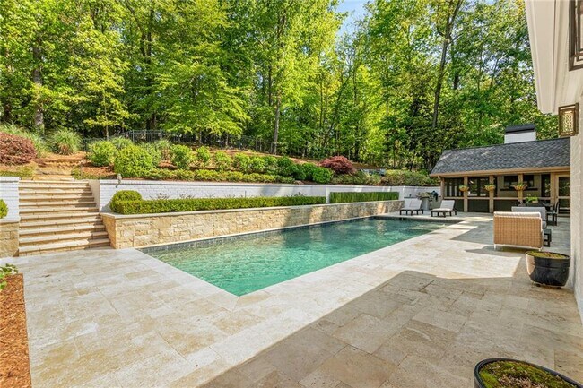Discover one of Sandy Springs’ best-kept secrets—Kingston Drive. Set on more than an acre along a quiet,private non-through street,this inviting retreat offers exceptional privacy in one of Atlanta’s most conveniently located neighborhoods. Thoughtfully renovated,the home preserves the charm and character of the original structure while adding meaningful square footage,including a stunning top-floor primary suite overlooking the lush,private backyard oasis. A cozy living room with fireplace welcomes you through double iron doors on the main level,which also features a full bedroom with ensuite bathroom—ideal for guests or flexible living. A short flight of stairs leads to the open-concept main living level,where the kitchen flows seamlessly into a spacious dining area with fireplace set into a striking accent wall,and a warm,inviting family room. All enjoy direct access and views of the heated gunite saltwater pool and screened-in porch,surrounded by thoughtfully curated landscaping. The travertine pool deck provides comfort during warmer months,while the screened porch—complete with fireplace and TV—extends outdoor living well into cooler seasons. The third level offers three additional bedrooms,two full bathrooms,and generous closet space. The fourth-floor primary suite is a private retreat featuring a dedicated laundry center,spacious primary bathroom,and custom walk-in closet. Outdoors,the terraced yard includes additional green space,a fire pit,and a garden room with half bath and outdoor shower—completing a truly serene outdoor sanctuary. All 22 homes on Kingston Drive sit on one-plus acres,ensuring space,privacy,and a peaceful setting. Convenient to GA-400,I-285,Pill Hill,and an array of shopping and dining destinations. No short-term rentals. Home is not offered furnished. MLS ID 7715288