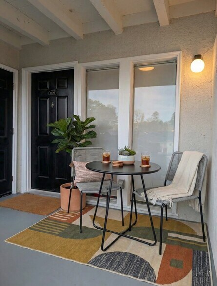 This beautifully reimagined end-unit offers a peaceful, designer retreat tucked away in a quiet corner of a gated community. Recently transformed with a "head-to-toe" renovation, featuring luxury vinyl flooring in a warm, versatile oak tone and fresh neutral paint throughout. The kitchen is fully updated with new cabinetry, granite countertops, a designer backsplash, and brand-new appliances, while the bathroom stands out with a custom vanity and elegant tile work. Beyond the aesthetic updates, the home offers total peace of mind with a brand-new water heater and a newly installed HVAC system. What truly sets this unit apart is its unique layout and serene setting. The living space is flooded with natural light and features charming original built-ins perfect for personal touches. Storage is exceptionally generous, boasting two separate walk-in closets—one of which is oversized and versatile enough to serve as a small home office or seasonal storage. Step outside to your private covered porch to enjoy views of the expansive lawn, sand volleyball court, and pool; because the building is nestled deep within the complex, it remains remarkably quiet and free from road noise. Residents also enjoy access to a gym, dog park, and car wash station, all while being within walking distance of local shops and restaurants. This unit is move-in ready, and furniture can be included for those seeking a truly effortless transition.