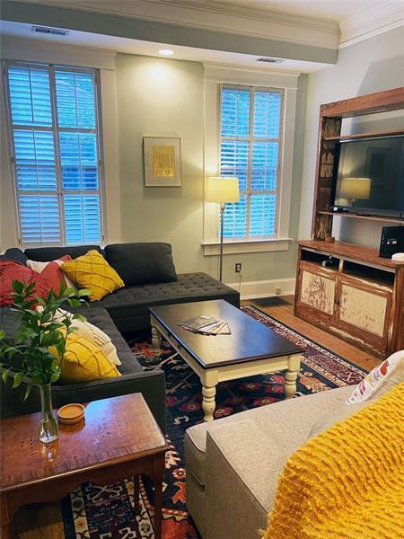 Charming first floor corner unit condo in Candler Park! Walk to restaurants, shopping, and bike trails are abundant. The unit has renovated bathrooms, high ceilings, large kitchen, decorative fireplace with classic built-ins, and hardwood floors. Deck off master, back porch with porch swing. Exterior storage. Rear parking lot with one space per unit, street parking in front. Front entrance through secure common lobby, rear entrance from back porch directly into kitchen. Walking distance to Inman Park, L5P, & Beltline FULLY FURNISHED.