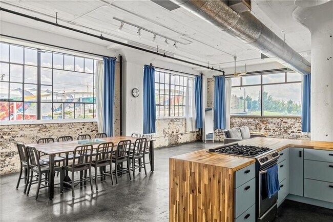 Industrial loft living doesn't get better than this! Soaring 11' ceilings and spacious living areas welcome you into this modern condo conversion at The Giant, located less than one mile from Mercedes Benz, Centennial Park, The Aquarium, MARTA, and over a dozen restaurants & bars. This oversized 1BR lives large and can be rented partially furnished. Tons of natural light abound throughout the space. Recently renovated kitchen with stainless steel appliances, butcher block counters, & a gas stove. In-unit laundry located in the hall bath. Amazing shared rooftop deck is perfect for relaxing or entertaining. Unit comes with one garage parking space. Welcome home!