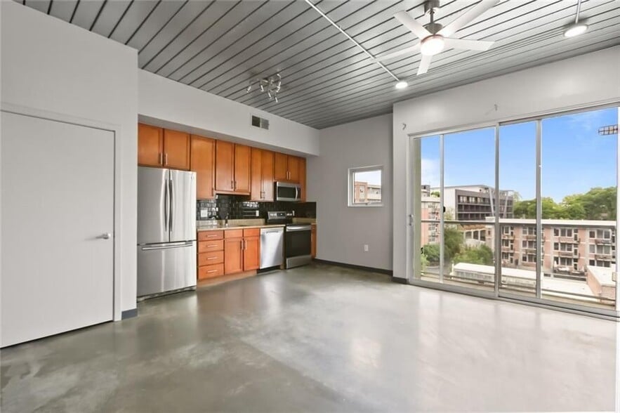 Modern top-floor corner loft at Ponce Springs Condominiums in Old Fourth Ward, directly across from Ponce City Market and steps from the Atlanta BeltLine Eastside Trail. This light-filled 1-bedroom, 1-bath home features polished concrete floors, 10-foot ceilings, large windows, and an open-concept layout with a private balcony. The kitchen offers granite countertops, stainless steel appliances, and warm wood cabinetry. Additional highlights include in-unit washer/dryer, new HVAC system, assigned covered parking, and secure gated access. In-unit washer and dryer. Enjoy walkable access to top dining, shopping, parks, and entertainment in one of Atlanta’s most vibrant neighborhoods.