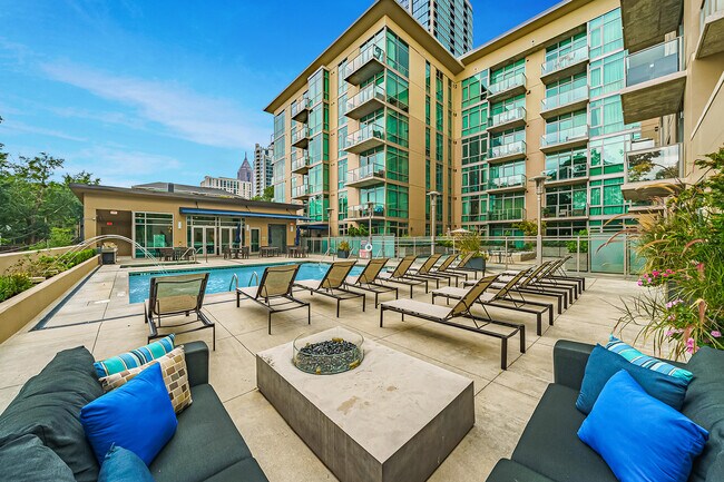 Pristine penthouse residence offering stunning treetop views, soaring 11-foot ceilings, and dual walk-out balconies overlooking the pool. Ideally situated in an unbeatable location, with popular restaurants, shops, Piedmont Park, and vibrant city attractions just steps from your front door. Residents enjoy access to exceptional amenities including concierge services, a state-of-the-art fitness center, on-site restaurant, resort-style pool and spa, and a fully equipped business center. The sleek, modern kitchen features stainless steel appliances, granite countertops, and a breakfast bar, all seamlessly opening to the spacious living area with hardwood floors and dramatic floor-to-ceiling windows. The expansive primary suite offers a spa-inspired bath, while a generously sized secondary bedroom includes its own full bathroom—ideal for guests or roommates. Additional highlights include two covered, secured parking spaces. Available July 1, 2026.