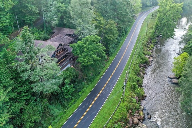 The cabin is located in Blue Ridge GA across from the Stanley Rapids of the Toccoa River with access via a stairway leading from the cabin down to the river where you can fish, kayak, tubing, swim and enjoy. It has 2 en-suite bedrooms with king size beds and balconies overlooking the river, 1 honeymoon with king size bed and balcony overlooking the river with private Jacuzzi for 2 people, kitchen, bathroom and 4 low-ceiling lofts each with queen size beds, 1 single bed and accessed by a short flight of stairs