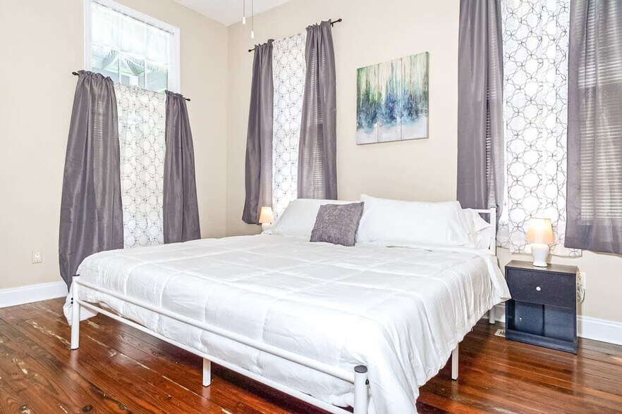 Feel at home in this charming Americana Cottage in Uptown, the closest historic Columbus home to Fort Moore. This home offers a cozy retreat. The welcoming front porch greets guests. The front door leads into an open-concept living room and fully equipped kitchen/dining room space that runs the length of the house. The living room is complete with a pull-out sofa and SmartTV, and the kitchen has everything needed to prepare meals during your stay. The two bedrooms showcase the gorgeous, historic hardwood floors. Enjoy the fenced-in backyard, deck, and charcoal grill. A pack 'n play/travel crib and a vacuum are available upon request. This home is located in the historic downtown residential district, right next to Victory Drive, providing easy access to Fort Moore. Enjoy a relaxing stroll on the Riverwalk, which is only a short, 3 block walk. Downtown Columbus is only a mile away. This home is in the perfect location to explore historic Columbus and the scenic Chattahoochee River. Quiet hours are between 10 PM and 7 AM. If our cleaning crew reports any signs of smoking cigarettes, vapes, e-cigs, pipes, etc. (smell, ash, etc.) in or around the home, an automatic $500 damage charge will be incurred. The same charge applies if cigarette butts are found outside of the home. If marijuana is smoked in or around the home a $500 fee will be charged, and details about the reservation may be turned over to the appropriate authorities. Parties are prohibited at the home. Other events are permitted at the home only with prior approval. Pets are permitted at this home with a non-refundable fee. You will be responsible for cleaning up all evidence of your pet, including fur inside the home and waste from the yard. Pets must be crated when they are left unattended in the home and are not allowed on furniture or beds. You will be responsible for any damage to the home or its furnishings during your stay. Please bag all trash and place it in the bins provided. There is a $100 charge for third party trash removal if an excessive amount of trash is left at the property. Registration Number: STVR-11-23-7556 [SI]